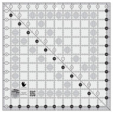 The 1/4 inch dashed lines printed on two adjoining sides aid in trimming seam allowances. Use the patented Turn-A-Round feature — designated by the easy to read, numerical white numbers (printed on black dots) and the 1/2 inch grip sides — to add the 1/2 inch seam allowance. A 45 degree angle is printed in black and is used to trim half-square triangles to size. White horizontal and vertical lines are printed on the square so the center of the ruler is easily distinguishable. Use these lines to square up blocks based on four-patches or embroidered and appliqued blocks.