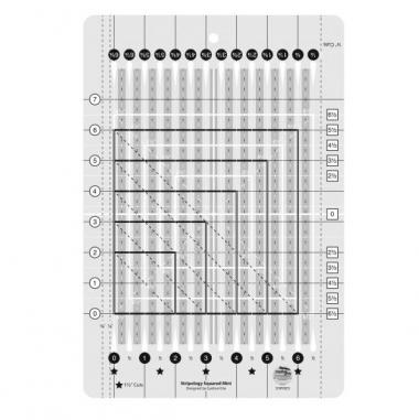 Stripology Squared Mini has all of the features of the original Stripology Squared ruler plus a few additional features you will love. It includes markings to square up half-square triangles, quarter-square triangles, and blocks up to 6 inch finished.