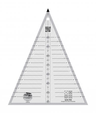 This double duty 45 degree Spider Web ruler creates a variety of blocks using 3 to 10 inch strips or strata widths. Once you have cut the triangles, reposition the ruler to cut the background kite and/or corner shapes. Depending on the positioning of the light and dark fabrics, the finished blocks resemble a spider web or a four-pointed star.