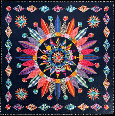 This 78 x 78 quilt features the Kaleidoscope fabric collection by Annabel Wrigley for Windham fabrics! Quilt elements include five 10” Compass blocks, a 30” Round Sunflower block, a 32 piece Dresden band, a piece diamond border, and faced appliqué shapes.